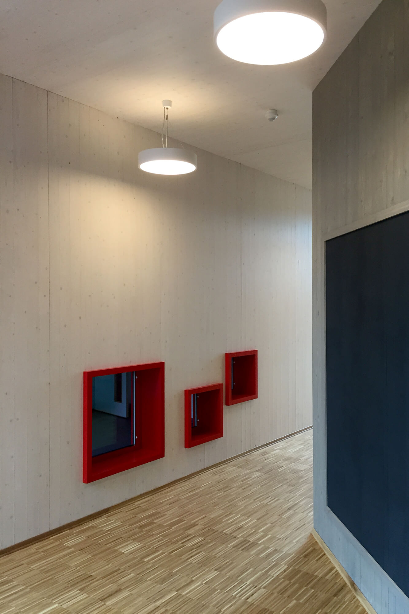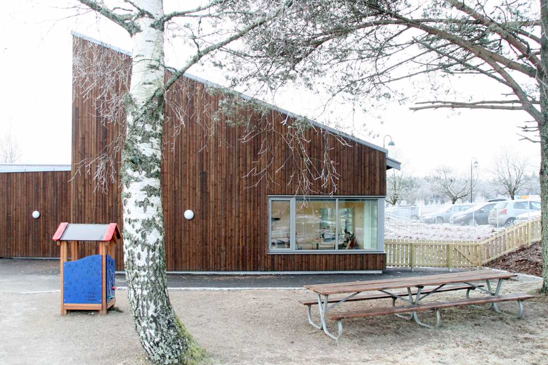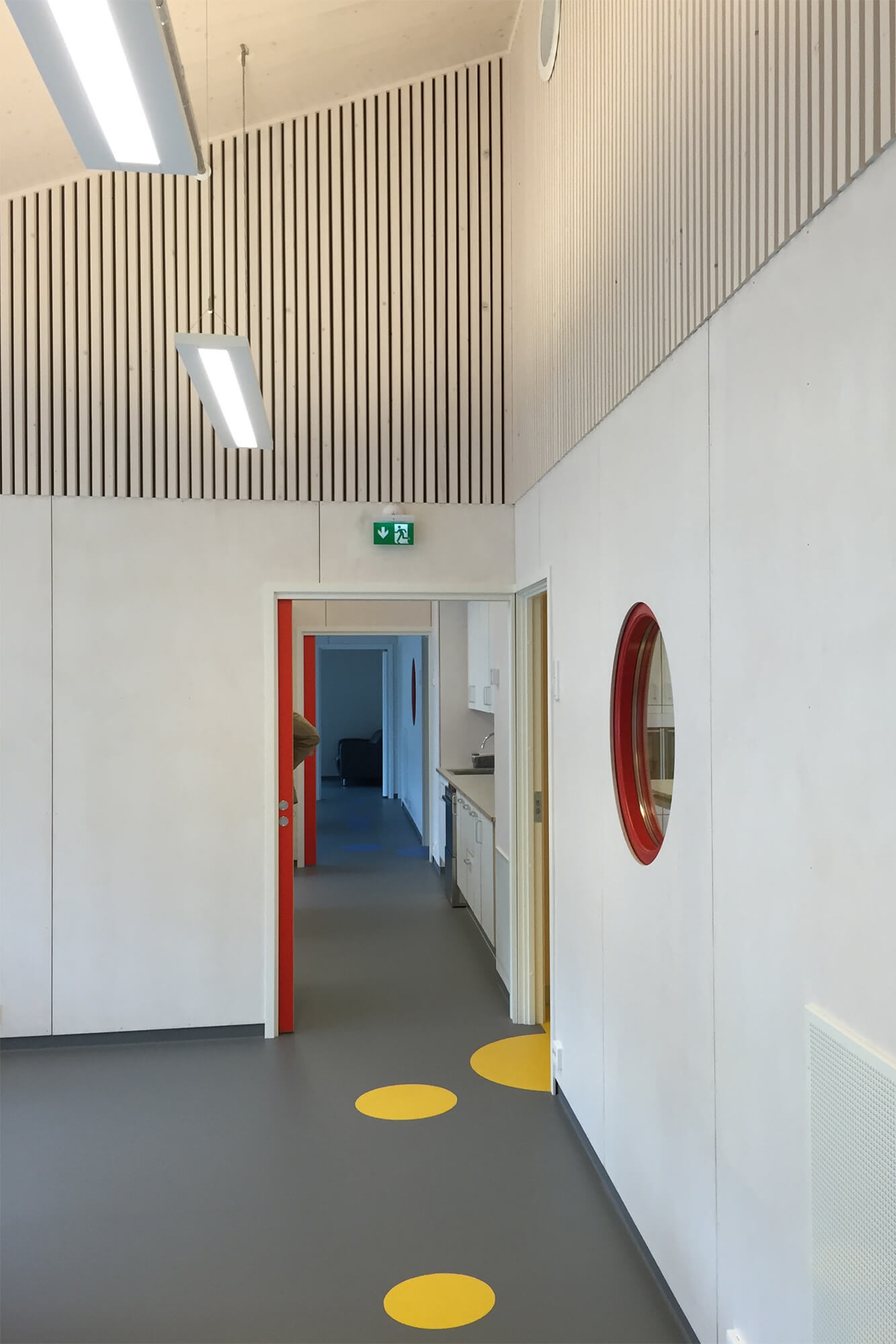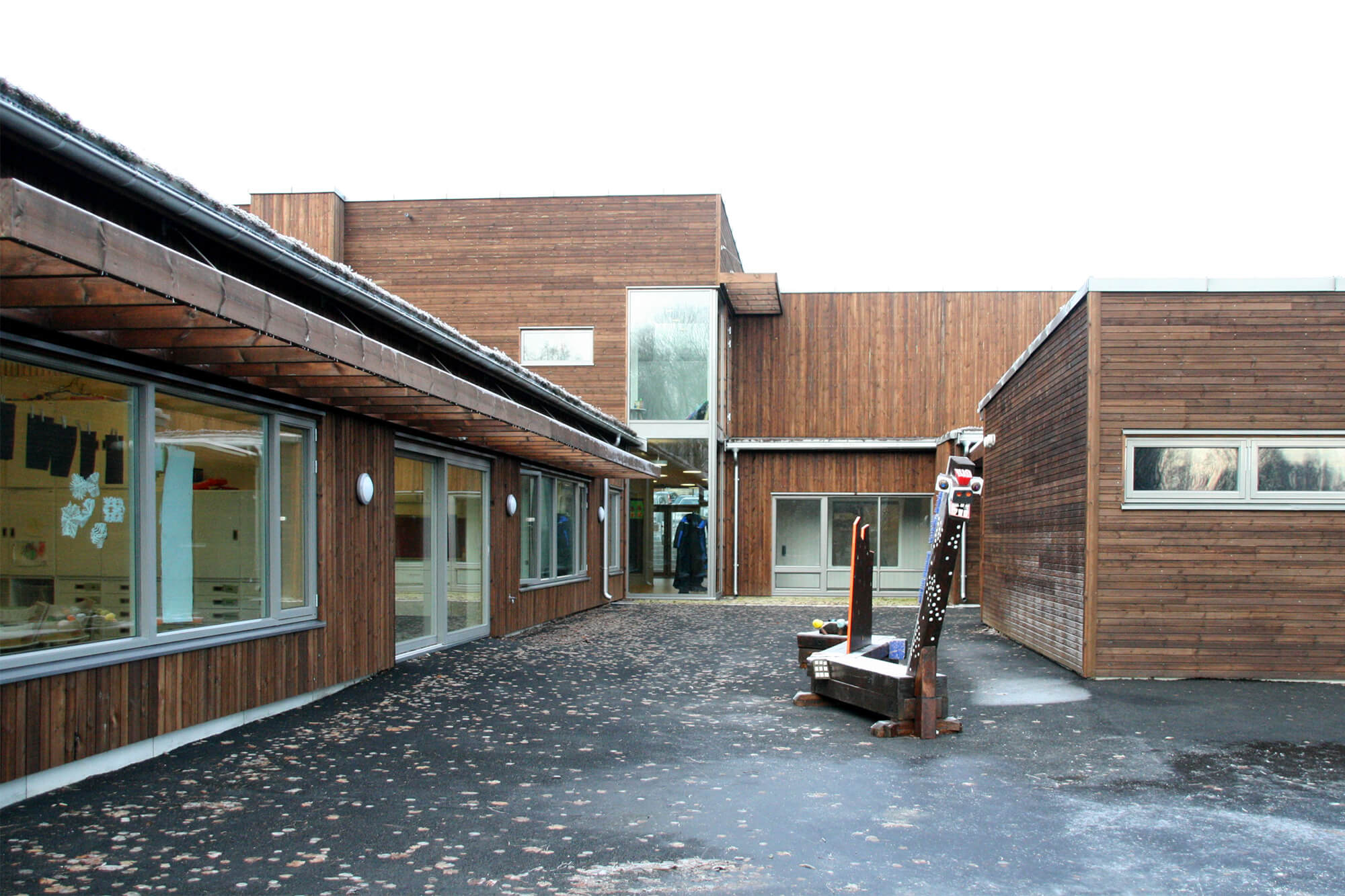 Bygget er organisert av tre like fløyer knyttet til et sentralt allrom. De tre fløyene består av to avdelinger hver, med fellesfunksjoner som stellerom og kjøkken i midten. Avdelingene er åpne og fleksible med mulighet for å lukke av ulike soner ved behov for å dele opp i mindre gruppesamlinger. Hver avdeling har egen utgang direkte til utearealene.