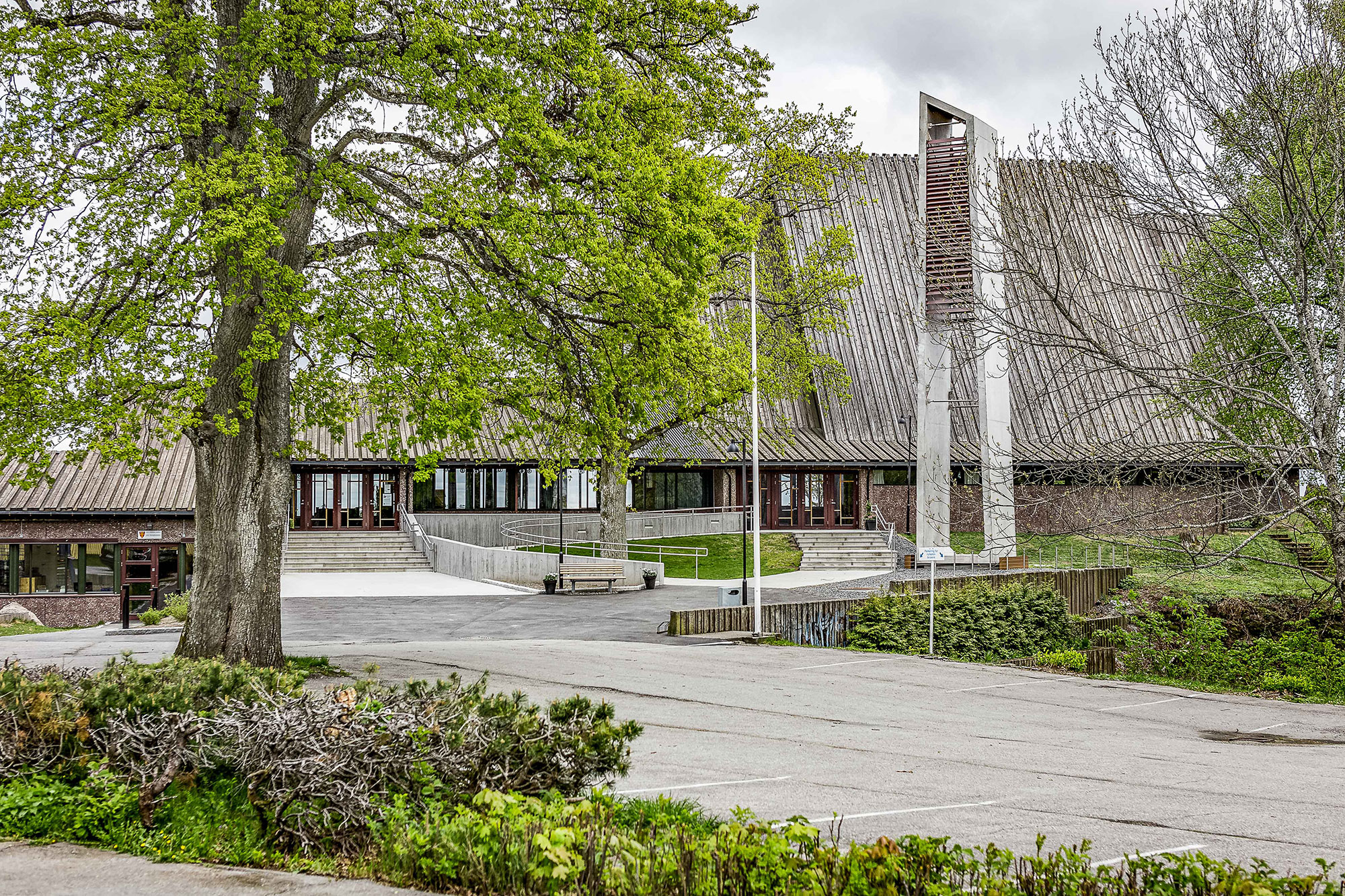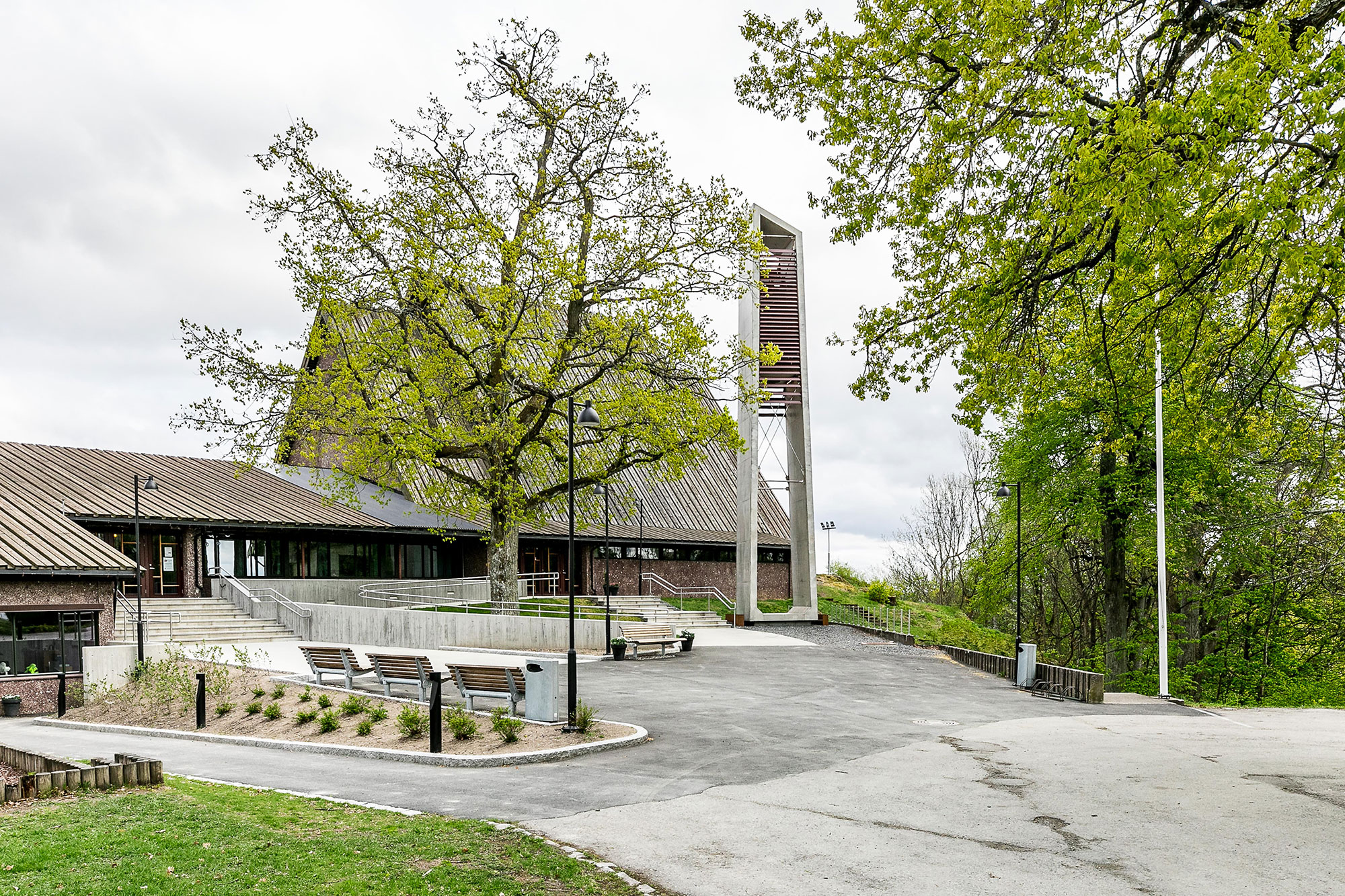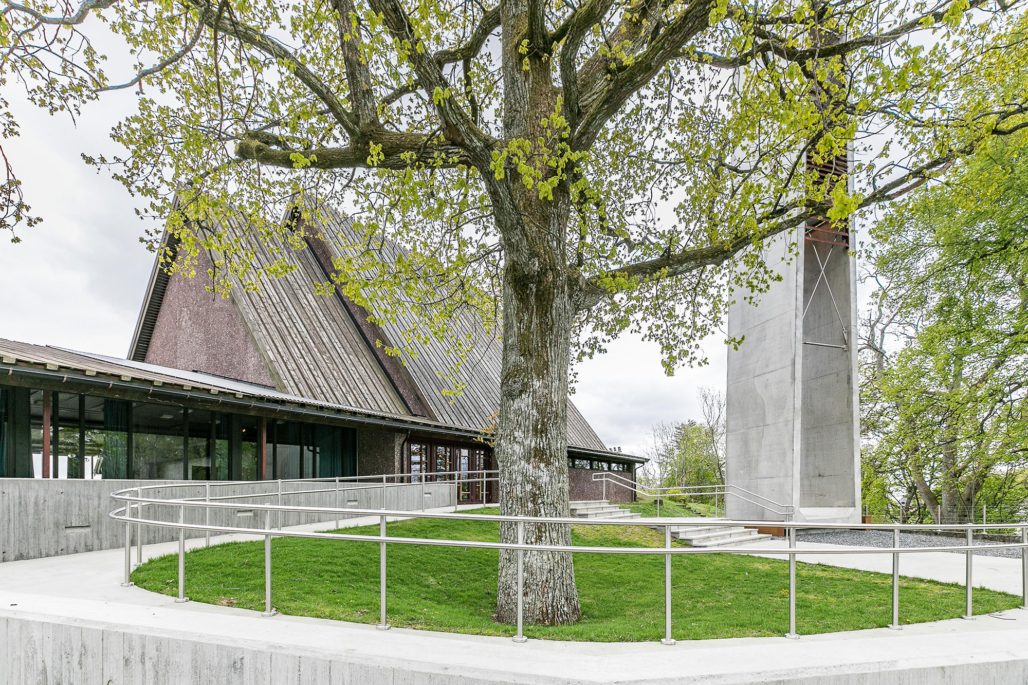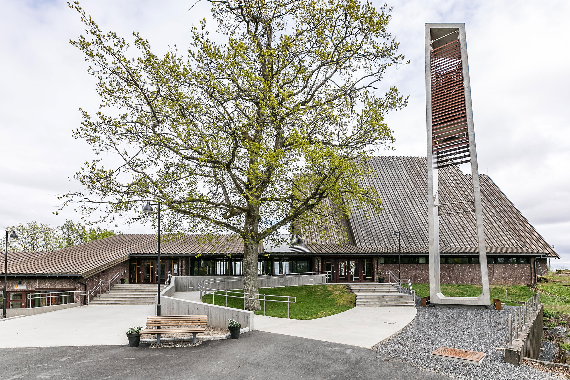 Jeløy kirke ble innviet i 1975 og er tegnet av Eva og Bernt Mejlænder. Kirken med sin beliggenhet ligger på en høyde med utsikt over hele byen. Bygningen er også kjent for Victor Sparres glassmaleri som dekker hele den søndre veggen. Inngangspartiet og forplassen trengte en oppgradering. Opprinnelige klokketårn var i meget dårlig teknisk tilstand med fare for å kunne rase. Prosjektet gikk ut på å gi klokketårnet en ny form. Designet er utført i formstøpt betong med ny klokkestol. Materialer er glatt betong og corten-stål. Lyssettingen gir en variert opplevelse av tårn med forplass.