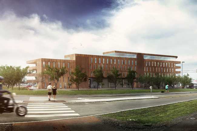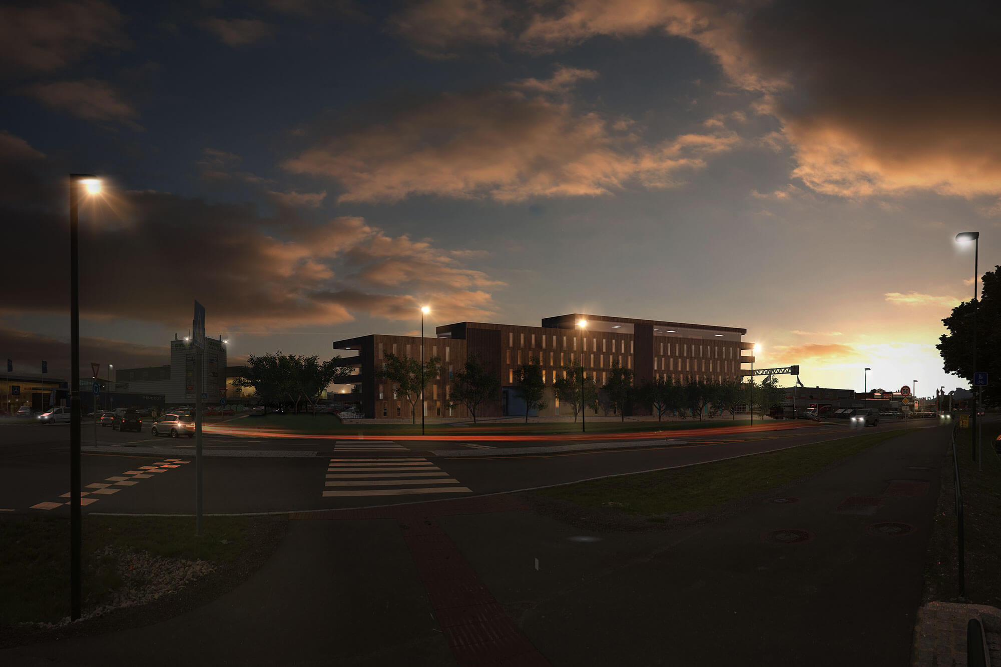 Konkurranseforslag til nytt kombinert kontor- og handelsbygg på Varnaveien 43 i Rygge. I forslaget er det lagt stor vekt på en at skape et bygg med en bæredyktig profil både sosialt, økonomisk og miljømessig.