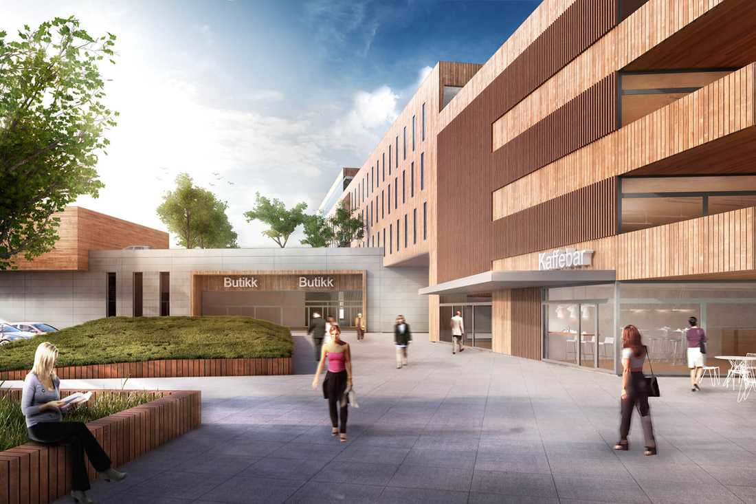 Mot nord-øst ”skyver” handelsdelen seg inn under kontorbygget i 1-2 etasje og skaper en dynamikk i og rundt bygget.